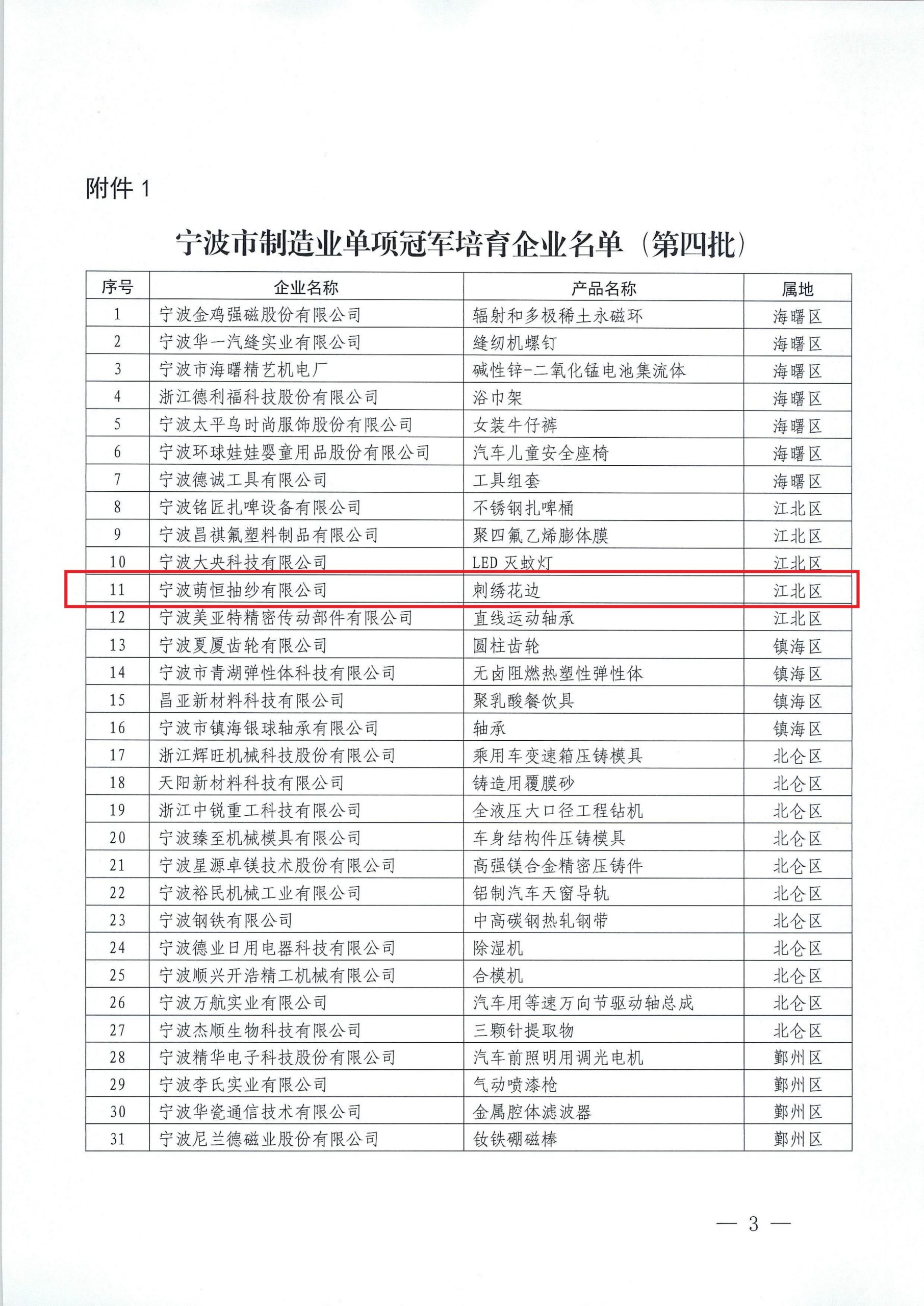 近日,寧波市經濟和信息化局公布了寧波市第四批制造業單項冠軍企業名單,萌恒抽紗的刺繡花邊榮幸登榜! 制造業單項冠軍企業是指長期專注于制造業某些特定細分產品市場,生產技術或工藝國際領先,單項產品市場占有率位居全球前列的企業,憑借在細分領域的“精耕細作”,推動制造業的創新發展。能入選單項冠軍培育企業,既是對我們的鼓舞,也是鞭策:站在新的起點,全體萌恒花邊員工要圍繞領繡時尚的產業定位,認真落實單項冠軍企業培育發展方案,專注產品領域的創新、產品質量的提升和品牌的培育,不斷改善客戶體驗,鞏固和提升產品市場地位,將萌恒花邊做專做精、做強做大。