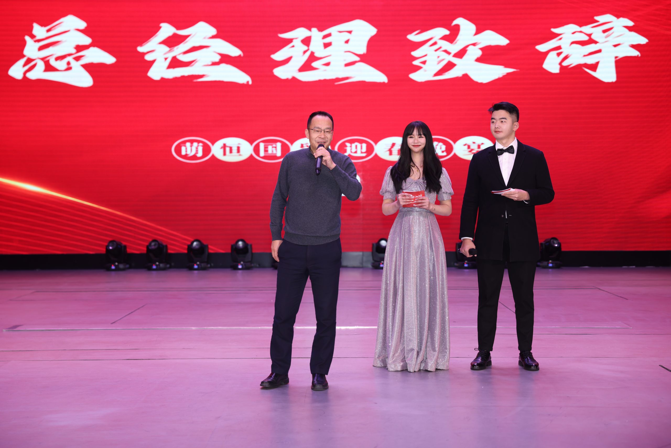 2月5日晚,“龍騰四海 共創輝煌”國貿新春晚宴在2024新春拜年視頻中拉開序幕。俊男靚女的主持搭檔,洋溢著青春與活力,讓人眼前一亮、耳目一新。晚宴伊始,國貿事業部總經理陳總向國貿全體成員致以新春賀詞,為萌恒家人送上滿滿的祝福,并與全體同仁共同舉杯,慶賀新年。