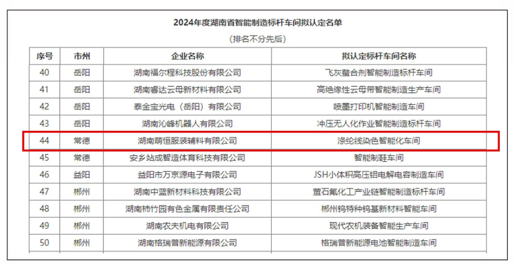 為貫徹落實黨的二十大關于“推動制造業智能化發展”的決策部署,縱深推進“智賦萬企”行動,加快發展新質生產力,湖南省工業和信息化廳于近日公布了認定的14家智能制造標桿企業和60個智能制造標桿車間。其中,湖南萌恒服裝輔料有限公司所屬滌綸線染色智能化車間獲批認定為湖南省智能制造標桿車間。
