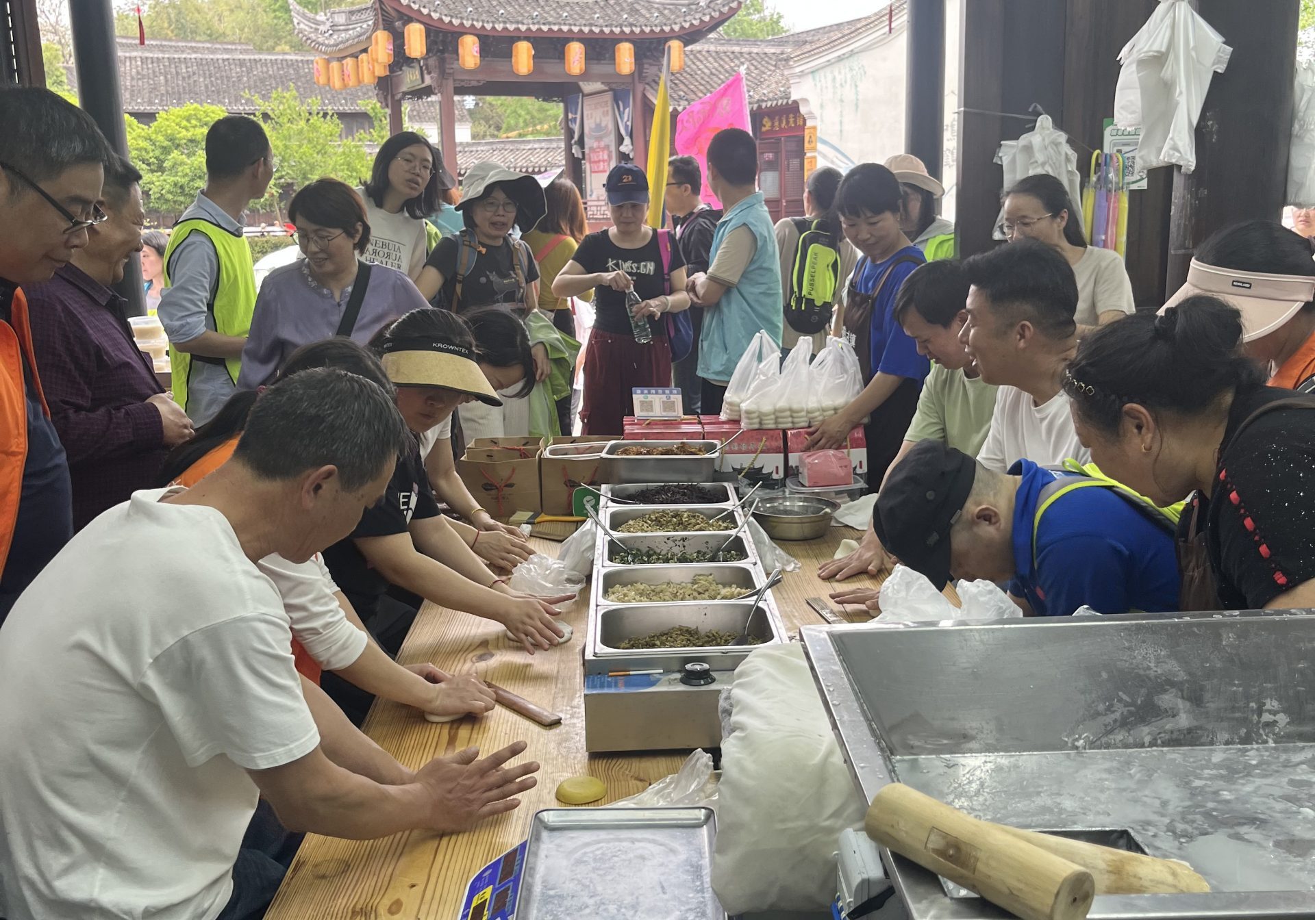 下午,一行人來到鳴鶴古鎮,體驗包年糕餃子的樂趣。大家熱情高漲,在師傅的指導下,紛紛動手學習包年糕餃子。剛開始包第一個時,不少人手法生疏,可到了包第二個時,手速變快不說,包出來的餃子也更加周正好看。現場有“手殘黨”的小伙伴請求支援,大家互幫互助,好不熱鬧,別有一番體驗。
