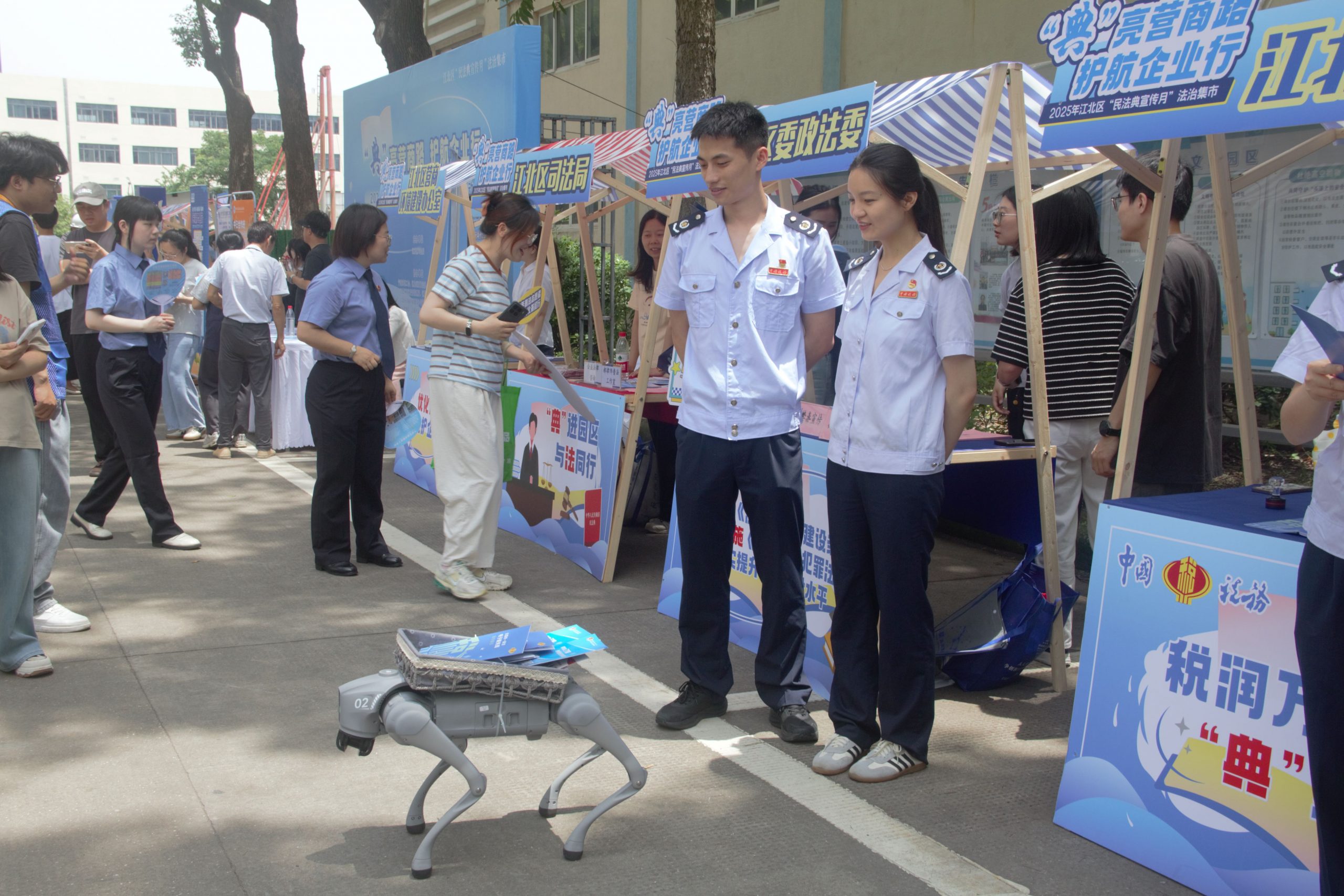 近日,“‘典’亮營商路 護航企業行”2025年江北區民法典進企業主題活動在萌恒科創園舉行。本次活動由江北區司法局、江北區普法辦主辦,寧波市總工會、江北區委政法委等十余家單位協辦,通過在現場擺放法治攤位、趣味游戲、有獎問答、法律咨詢等多種形式為園區企業職工“解鎖”豐富多樣的法律知識,吸引近300名職工參與。 時近中午,樹蔭下的法治集市數余個特色攤位沿園區主干道兩側排開。來自交通技工學校帶來的智能機器狗更成為全場的“明星”。它不僅外形萌趣可愛,還馱著一摞精美的法治宣傳手冊,仿佛一位小小的“普法使者”,時而靜坐招手賣萌,時而靈活穿梭人群,引得來往職工紛紛駐足互動,加入法治游戲中。 “嗚嗚……”無人機低飛半空,精準記錄游戲現場。“普法盲盒”“投壺問‘典’”“法治福袋”等集普法性和趣味性為一體的法治游戲展區歡聲一片、熱鬧非凡。工作人員積極為職工們講解游戲中的法律知識點,引導大家在歡樂中學習法律、感受法治。大家紛紛在“民法典”打卡點前拍照留念,留下難忘的法治記憶。 此次活動以“黑科技”助力“法治行”,用“玩中學、趣中悟”的生動普法方式,讓廣大職工在輕松的氛圍中感受法治的力量。