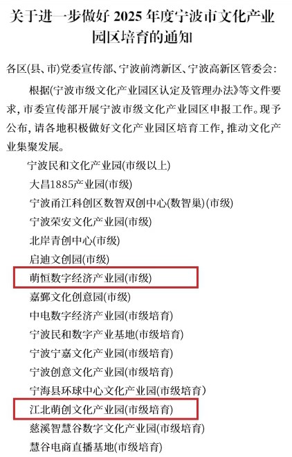 萌恒數字經濟產業園與江北萌創文化產業園獲得市級殊榮 http://m.hzxhdd.com/2025/07/30/%e8%90%8c%e6%81%92%e6%95%b0%e5%ad%97%e7%bb%8f%e6%b5%8e%e4%ba%a7%e4%b8%9a%e5%9b%ad%e4%b8%8e%e6%b1%9f%e5%8c%97%e8%90%8c%e5%88%9b%e6%96%87%e5%8c%96%e4%ba%a7%e4%b8%9a%e5%9b%ad%e8%8e%b7%e5%be%97%e5%b8%82/ Wed, 30 Jul 2025 07:37:29 +0000 http://m.hzxhdd.com/?p=5574 近日,中共寧波市委宣傳部正式公布2025年度市級文化產業園區認定名單,萌恒數字經濟產業園與江北萌創文化產業園雙雙入選,分別獲評“市級園區”和“市級培育園區”稱號。
