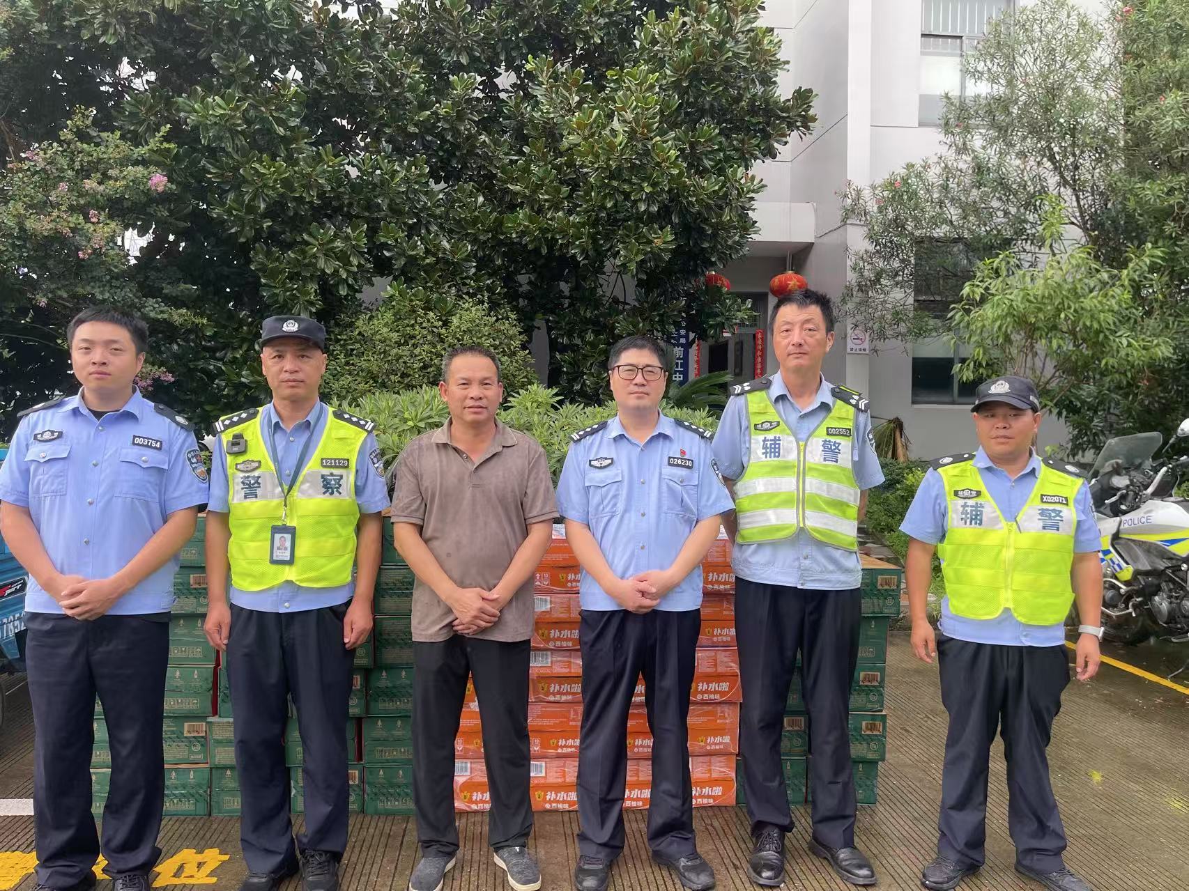 志愿者們將各類飲品、水果、花露水等物資先后送到鄞州交警、城管和環衛工人的手中,并向他們表示誠摯的謝意:“那么炎熱的天氣在外執勤真是辛苦了。”“謝謝你們為這座城市做出的貢獻!”“天熱注意防暑降溫,當心身體。”